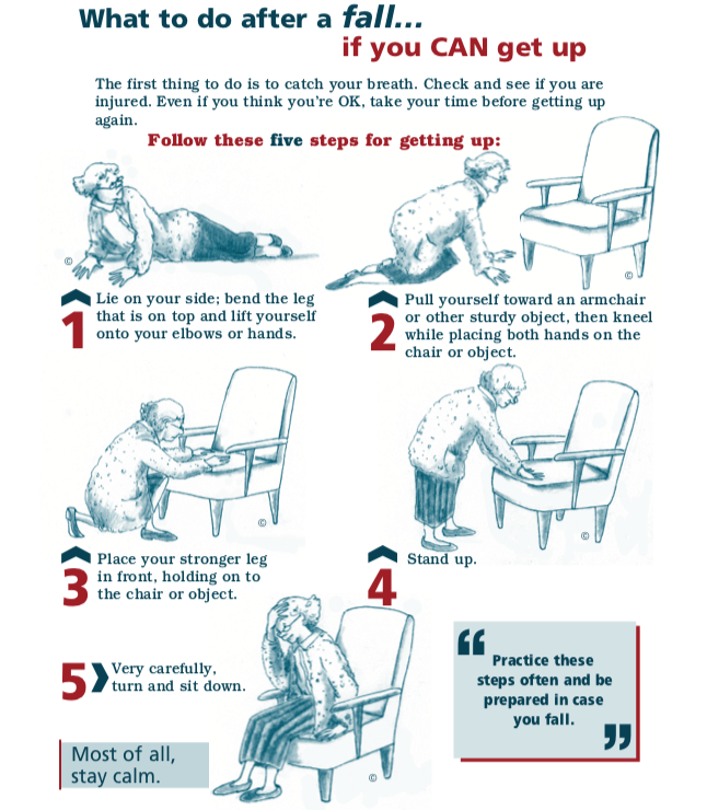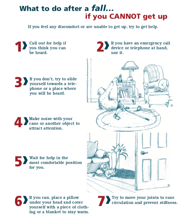 There are specific steps to follow if you need to take in the event that you have fallen. Here are steps that the Public Health Agency of Canada recommends you should do if you fall and you can get up, can’t get up or if you witness a fall. Make sure to practice these steps so that you are prepared in the event of a fall.
